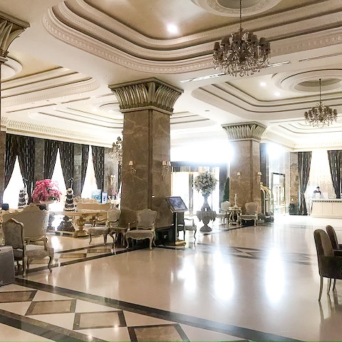 Lobby przypomina nieco pałacowe wnętrza. Marmurowe ściany, posadzki, kryształowe żyrandole, bukiety pięknych kwiatów, wszystko to sprawia wrażenie bardzo luksusowego miejsca. I jest to odczucie jak najbardziej słuszne, miejsce niewątpliwie jest luksusowe.